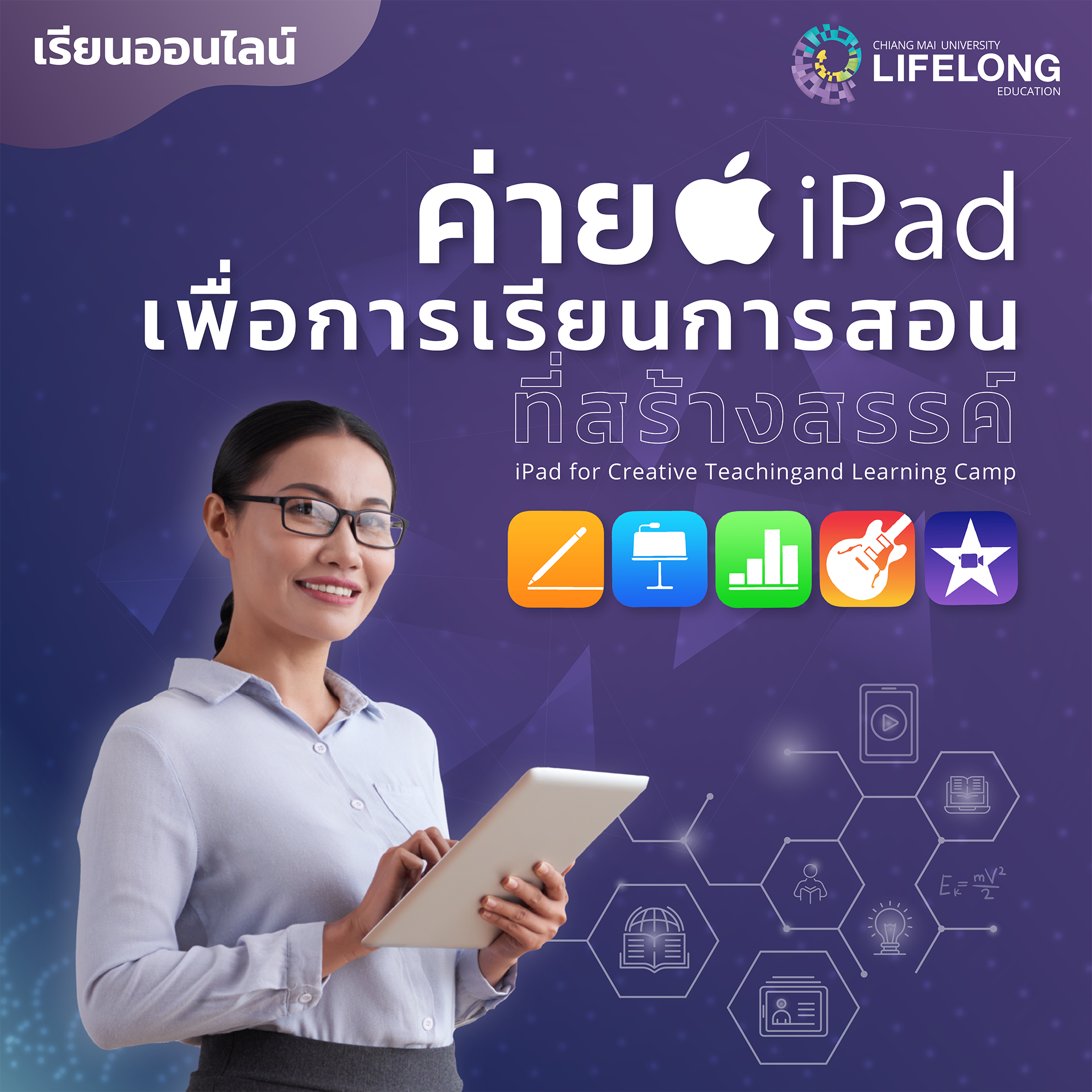 จากสถานการณ์ปัจจุบันที่ทุกภาคส่วน ได้รับผลกระทบกจากการระบาดของโรคติดเชื้อไวรัสโคโรนา (COVID-19) ทำให้ทุกฝ่ายต้องเตรียมพร้อมและปรับแผนต่าง ๆ เพื่อให้การทำงานสามารถดำเนินต่อไปได้อย่างต่อเนื่องเช่นเดียวดับภาคการศึกษา ที่บุคลากรครูนักการศึกษา และผู้ปกครองต้องปรับตัวและเรียนรู้แนวทางใหม่ในการจัดการศึกษาผ่านระบบออนไลน์ หรือการจัดการเรียนรู้ทางไกล (Remote learning) ให้มีประสิทธิภาพเป็นไปตามผลการเรียนรู้ที่คาดหวังที่กำหนดหลักสูตรอบรมออนไลน์ระยะสั้น เรื่อง ค่าย iPad เพื่อการเรียนการสอนที่สร้างสรรค์นี้ นึงจัดขึ้นเพื่อให้ผู้เข้าอบรมได้รับการพัฒนาสมรรถนะด้านการใช้เทคโนโลยีเพื่อให้สามารถสร้างสรรค์สื่อ บทเรียน และชิ้นงานที่ส่งเสริมการเชื่อมต่อการเรียนรู้ (Connected) การทํางานร่วมกัน (Collaborated) การคิดสร้างสรรค์ (Creativity) และสามารถปรับใช้เทคโนโลยีให้ เหมาะสมตามความต้องการของแต่ละบุคคลล (Personal) ผ่านการใช้งานแท๊ปเล็ตในระบบปฏิบัติการ iPadOS ร่วมกับแหล่งเรียนรู้ระดับมืออาชีพที่ไม่มีค่าใช้จ่ายในโปรแกรมเรียนรู้จาก Apple Teacher Learning Center เพื่อทำแบบทดสอบ และรับการรับรองเป็น Apple Teacher โดยในหลักสูตรนี้ประกอบด้วยกิจกรรม 6 โมดูล ได้แก่ 1) รู้ไว้ใช้สอนออนไลน์บท iPad 2) สร้างหนังสือให้มีชีวิตด้วย Pages 3) สร้างสื่อเคลื่อนไหวไปกับ Keynote 4) วางแผนและจัดข้อมูลให้เป็นภาพด้วย Numbers 5) สร้างศิลปินในทุกวิชาด้วย Garage Band และ 6) สร้างคลิปไว้สอนออนไลน์ด้วย iMovie
